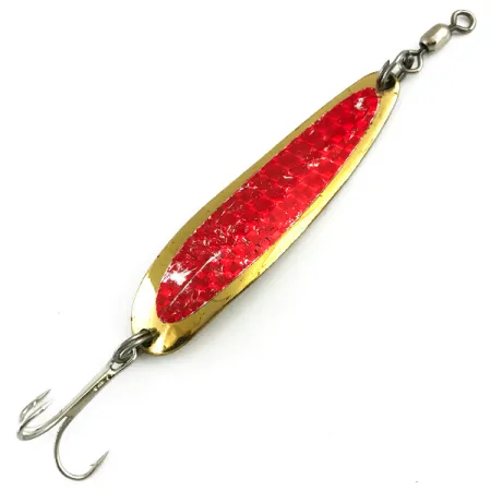 Позолота слугує основою цієї коливної блешні вагою 14 г (1/2 унції) — моделі, що довела свою ефективність у коробках рибалок Тихоокеанського Північного Заходу та регіону Великих озер. При довжині 6,5 см (2 1/2 дюйма), ця Luhr Jensen Krocodile Die #4 має червону призматичну вставку з візерунком під луску на опуклому боці, що слугує яскравою точкою прицілювання під час проводки. Клеймо на увігнутому боці, яке позначає її як виріб Luhr Jensen із Гуд-Рівер, штат Орегон, пов’язує цю приманку з історичним корінням бренду. Завдяки вужчому та товстішому профілю порівняно з багатьма традиційними «коливалками», ця модель створена для далеких закидань та облову глибоких шарів води, де зазвичай стоїть лосось або форель. Цей екземпляр з артикулом 5779 зберіг оригінальну фурнітуру, зокрема гострий трійник та встановлений спереду бочкоподібний вертлюжок. Що стосується зовнішнього стану, покриття залишається блискучим, а відтиски — чіткими, що відповідає оцінці стану 5/5. Маркування «DIE #4» вказує на конкретну форму, використану для створення її характерної гри.