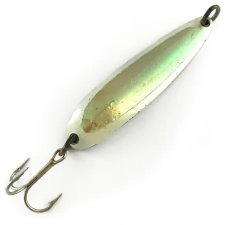 Ця коливальна блешня вагою 2/3 унції (19 г) вирізняється характерним малюнком у вигляді голографічної луски, що виблискує на світлі м'якими переливами рожевого та зеленого кольорів. Лицьовий бік виконаний у кольорі White / Pink Green Hologram, а на звороті нанесено класичне тиснення «KROCODILE», назву бренду Luhr Jensen та історичне місце виробництва — Гуд-Рівер, штат Орегон. Модель Die #4 (артикул 6131) довжиною 2,5 дюйма (6,5 см) має вужчий та товстіший профіль порівняно зі звичайними блешнями, що забезпечує відмінну далекобійність. Оснащення включає міцне заводне кільце в носовій частині та сріблястий трійник у хвості. Стан цього примірника — 5/5: покриття та тиснені написи на звороті збереглися чіткими та добре читаються. Популярна для лову лосося та форелі, ця приманка завдяки особливому розподілу ваги дозволяє ефективно обловлювати глибокі горизонти води. Хромована підкладка створює контрастні відблиски, що чудово поєднуються з перламутровим голографічним покриттям лицьової сторони.