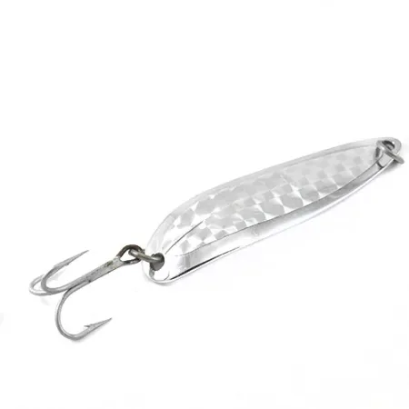 Гранована насічка у формі риб'ячої луски на опуклій стороні створює виразну текстуру цієї нікельованої коливної блешні. Маючи довжину 8,5 см та вагу 23 г, ця Krocodile Die №5 (артикул 1190) вирізняється міцною конструкцією з товстого металу, що є характерною ознакою виробника з Гуд-Рівер, штат Орегон. На увігнутій стороні приманки чітко викарбувано назву бренду Luhr Jensen та позначення моделі. Ця приманка знаходиться у стані 5/5, має чисту дзеркальну поверхню та повністю оригінальну фурнітуру. Її профіль розроблений для далеких закидань з пірсів або берега, де необхідно дістати до глибших ділянок водойми. Міцний трійник закріплений у хвостовій частині надійним завідним кільцем, а головна частина оснащена аналогічним кільцем для надійного кріплення жилки.
