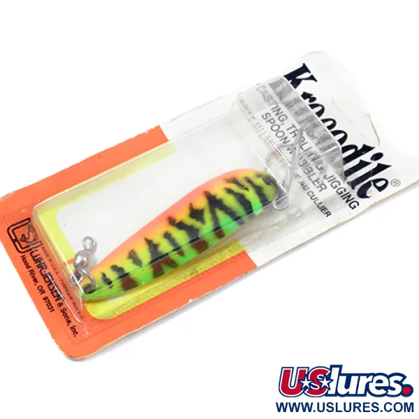 Ця масивна коливалка довжиною 3 1/4 дюйма (8,5 см) є незамінною для рибалок, яким потрібно дістати хижака на глибині. Виразні чорні «тигрові» смуги поверх неонового зелено-помаранчевого градієнта формують забарвлення Fire Tiger цієї моделі Krocodile Die №5 — такий колір розроблений для кращої помітності у каламутній воді. Цей екземпляр з артикулом 1978 — новий, він зберігається у заводському пакуванні Luhr Jensen & Sons (Гуд-Рівер, Орегон). Товстостінний метал забезпечує універсальність: на пакуванні виробник прямо зазначає, що блешня підходить для закидання, тролінгу та джигінгу. Вага 3/4 унції (21 г) забезпечує необхідну щільність для дальніх закидів у сильний вітер або для швидкого досягнення дна на течії. Оснащення включає вертлюжок у носовій частині для запобігання перекручуванню жилки та міцне заводне кільце у хвостовій частині. На звороті пакування збереглася оригінальна етикетка, що підтверджує колір та розмірні характеристики. Прозорий блістер дозволив зберегти насиченість фарби та блиск металевих поверхонь.