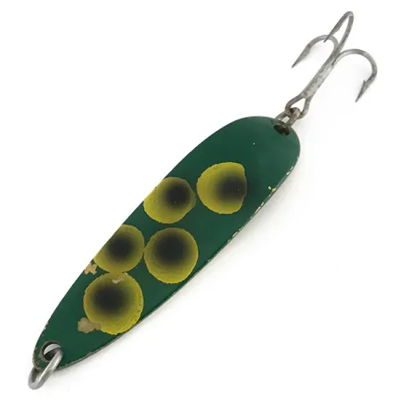 Основа з полірованої латуні додає солідної ваги цій коливалці для закидання та тролінгу, виготовленій у Гуд-Рівер, штат Орегон. Зовнішній бік приманки має класичне забарвлення «жаба» — п'ять чітких жовтих цяток із темними серединками на фоні насиченої темно-зеленої фарби. На звороті чітко видно штамп виробника «LUHR JENSEN» та назву моделі «KROCODILE», а також оригінальну заводську наклейку з артикулом 8110. Масивне металеве тіло вагою 28 г (1 унція) розроблене для закидів на такі дальності, що недоступні для легших блешень. При довжині 8,5 см (3 1/4") вона оснащена потужним трійником на міцному заводному кільці, а зовнішній стан приманки дуже добре зберігся. Стан цього екземпляра можна оцінити на 5/5 завдяки чистим поверхням та чітким написам. Латунна основа створює природні відблиски у товщі води, що в поєднанні з контрастним зеленим верхом ефективно працює під час проводок на великій відстані.