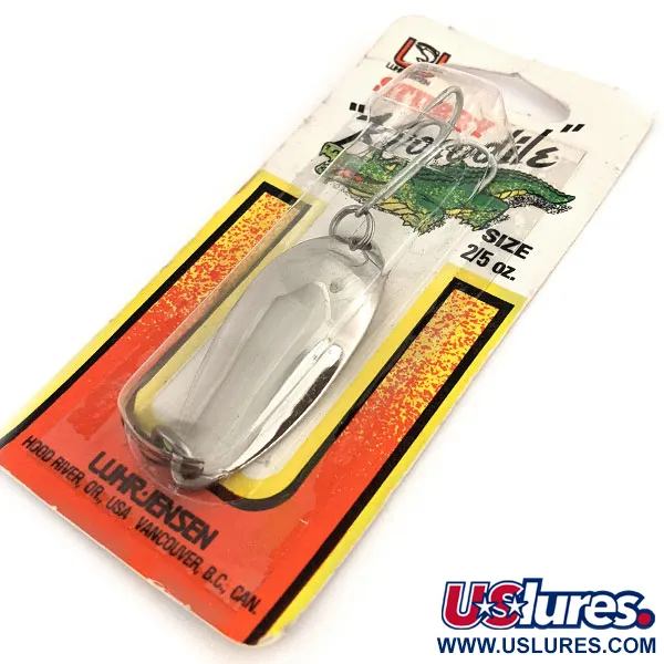 Ця блешня вагою 1/2 унції (14 г), вкрита полірованим нікелем, зберігає в собі традиції виробництва Luhr Jensen у Гуд-Рівер, штат Орегон. Модель Krocodile Stubby з артикулом 12687 має довжину 2 1/4 дюйма (5,5 см) і пропонується в оригінальній вінтажній упаковці. Цей екземпляр не був у використанні, завдяки чому дзеркальні поверхні та оригінальна фурнітура збереглися в такому ж вигляді, як і в день виходу з заводу. На самій підкладці вказано, що приманка розповсюджувалася на північному заході США та в Канаді, що підтверджує універсальність бренду для різних умов лову. Корпус із товстостінного металу розроблений спеціально для облову глибоких ділянок та дальніх закидів. На звороті упаковки розміщено пропозицію з каталогу, де згадуються інші легендарні вироби сімейства Luhr Jensen, такі як Kwikfish та Chief Smoker.