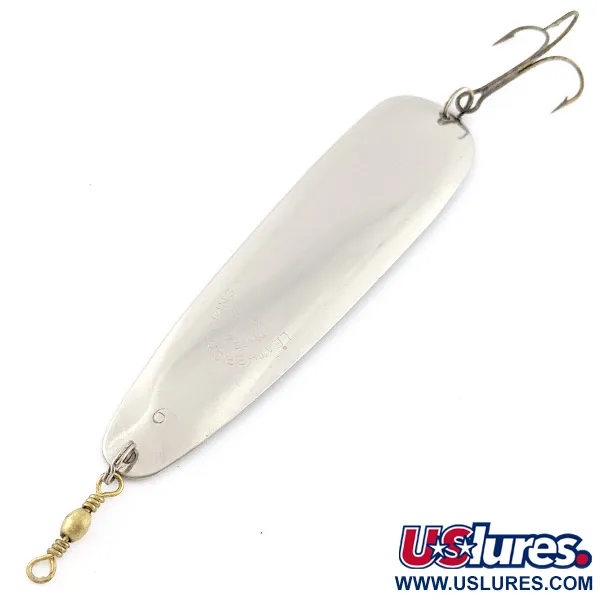 Ця подовжена коливальна блешня вагою 14 г (1/2 унції) — класичний зразок американської якості від Leather Stocking. Маючи довжину 11,5 см (4 1/2 дюйма), модель Leather Stocking #9 (артикул 23121) вирізняється полірованим сріблястим покриттям, що виблискує на її вузькому вигнутому тілі. Виготовлена в США, приманка оснащена гострим трійником у хвостовій частині та вертлюжком латунного кольору спереду. Дзеркальна металева поверхня відмінно збереглася, стан оцінюється на 5/5. Ця модель має простий, але ефективний профіль, який рибалки часто обирають завдяки її помітності в товщі води під час лову в закид або тролінгу.