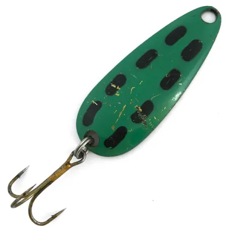 На зворотному боці кольору латуні чітко викарбуване маркування «LEN THOMPSON NO. 0», що вказує на походження цієї канадської блешні. При довжині 2 1/2 дюйма (6,5 см) приманка має класичний зелений лицьовий бік із виразними чорними цятками та золотистими вкрапленнями, що імітують природну здобич. Завдяки вазі 3/5 унції (17 г) вона має характерну повільну перевалисту гру, яка десятиліттями робить її незамінною для лову щуки та озерної форелі. Цей конкретний екземпляр (артикул 6765) оцінюється на 4/5: покриття на випуклому боці добре збереглося, а внутрішня ввігнута частина має чисту золотисту поверхню. Оснащення включає міцне заводне кільце та вінтажний трійник, що зберіг свою цілісність. З 1929 року Len Thompson приділяє особливу увагу балансу цих блешень, що робить їх надійним вибором як для закиду, так і для тролінгу в різних умовах прісних водойм.