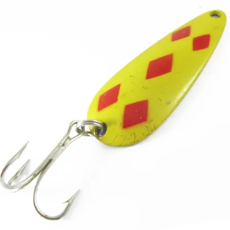П’ять червоних ромбів чітко нанесені на яскраво-жовтому тлі цієї канадської класики. Ця блешня (код товару 3681) вагою 28 г (1 унція) має традиційний зворотний бік латунного відтінку, який колекціонери шукають у ранніх моделях Len Thompson №2. З моменту заснування бренду в 1929 році ці приманки виготовлялися так, щоб імітувати силует малька, і цей 8-сантиметровий (3 1/4") екземпляр має характерне штамповане маркування на зворотному боці. Оснащена сріблястим трійником, ця приманка є незамінною для тих, хто ловить щуку чи озерну форель у закид або тролінгом. Забарвлення Five of Diamonds є чи не найвідомішим у каталозі; воно розроблене для того, щоб забезпечити чудову помітність за різних умов на воді. Стан оцінено на 4/5: на жовтій фарбі є поодинокі подряпини та легкі сліди використання, проте міцність металу та фурнітури залишається відмінною. Блешня спроектована для повільної розмашистої гри — технічної характеристики, що залишається незмінною для виробника протягом майже століття.