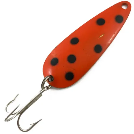 Лицьову сторону цієї 8-сантиметрової коливалки Len Thompson #2 вкриває яскрава оранжево-червона емаль із виразними чорними цятками. На звороті з латунним покриттям чітко вибито ім'я виробника — знак канадської якості, добре відомий колекціонерам ще з початку виробництва у 1929 році. Ця модель вагою 28 г (артикул 4652) має краплеподібну форму, розроблену для неспішної перевалистої гри, що імітує рухи кормової риби. Оригінальний трійник закріплений на міцному заводному кільці у хвостовій частині, а зверху передбачено отвір для кріплення жилки або додаткової фурнітури. Стан оцінено на 4/5: на лицьовій поверхні помітні незначні відмітки та дрібні сколи емалі від використання, тоді як на латунному звороті є кілька темних цяток окислення. Ця важка блешня залишається взірцем рибальської історії, створеним для лову щуки, озерної форелі та лосося на глибині або течії.