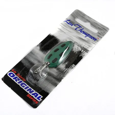 Забарвлення «Зелена жаба» (Green Frog) з темними овальними плямами є характерною рисою цієї блешні-коливалки Len Thompson №8 — класичної моделі для прісноводної риболовлі у Північній Америці. Ця компактна приманка довжиною 4 см (1 1/2 дюйма) та вагою 7 г (1/4 унції) належить до серії Original та має артикул 0741. Даний екземпляр не був у використанні та зберігається в оригінальному заводському пакуванні, на якому викладена історія бренду з Лакомба (Альберта, Канада), що бере свій початок у 1929 році. Форма приманки забезпечує повільну розмашисту гру під час проводки або тролінгу, імітуючи рухи живої рибки. На зворотному боці пакування міститься маркування Thompson-Pallister Bait Co. Ltd. разом із позначенням моделі «No. 8 GF». Блешня оснащена гострим трійником та має повністю оригінальну заводську фурнітуру.