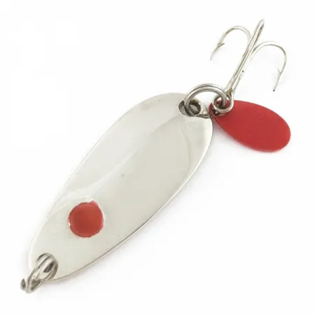 Нікелеве покриття надає цій блешні вагою 5 г (3/16 унції) яскравого блиску, що відсилає до класичної епохи американського дизайну снастей. При довжині 3,5 см (1 1/2 дюйма), ця блешня Les Davis Hotrod (артикул 24072) поєднує полірований металевий корпус із виразною червоною емалевою крапкою біля вушка для кріплення волосіні. До заднього заводного кільця прикріплена маленька червона пластикова пелюстка, яка прилягає до сріблястого трійника, створюючи додатковий візуальний акцент під час рівномірної проводки. Виготовлена в США, приманка представлена в кольорі нікель із червоним, що зберіг свій первісний вигляд без жодних вад. Цей рідкісний екземпляр має стан 5/5: він виглядає абсолютно новим, з ідеальною фурнітурою та дзеркальним блиском штампованої металевої поверхні. Характерний краплеподібний профіль блешні розроблений для ефективного закидання та стабільного утримання горизонту проводки за різних умов на водоймі.