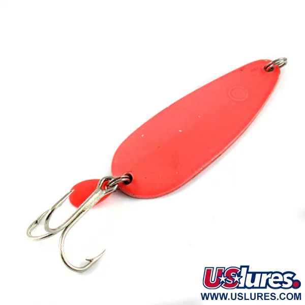 На нікельованій зворотній стороні чітко вибито маркування «HOTROD», яке ідентифікує цю коливалку вагою 32 г (1 1/4 унції) як надійний виріб від Luhr Jensen. При довжині 9 см (3 1/2 дюйма) приманка має яскраво-рожеве флуоресцентне покриття лицьової сторони, що контрастує з полірованою нікельованою підкладкою, створюючи універсальний візуальний образ. До заднього заводного кільця поруч із трійником додано невеликий червоний пластиковий атрактор, який слугує додатковим візуальним акцентом. Цей вінтажний екземпляр американського виробництва (артикул 2896) перебуває у стані 4/5, причому покриття та фурнітура залишилися чіткими та добре збереженими. Вона спеціально розроблена для важкого закидання та тролінгу, де її вага та профіль потрібні для облову глибоководних горизонтів.