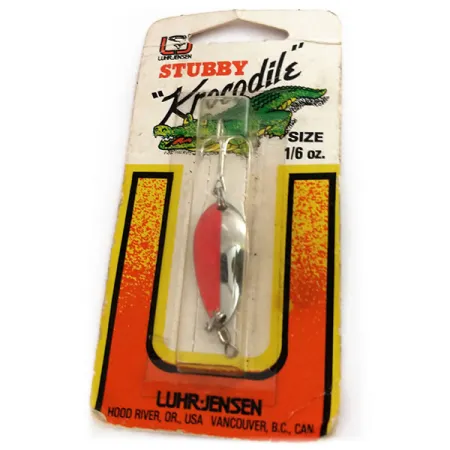 Ця компактна блешня вагою 4,5 г (3/16 унції) є рідкісним екземпляром у каталозі Luhr Jensen. Відома під офіційною назвою Lil' Kroc (або Krocodile Stubby) з артикулом 9914, вона має 3,2 см (1 1/4 дюйма) завдовжки. Покриття — класичне поєднання нікелю та червоного кольору, проте при огляді в ультрафіолеті помітно, що червоний бік має виражене флуоресцентне світіння, що робить приманку добре помітною на глибині або в темній воді. Корпус із товстого металу має глибокий та короткий вигин, що відрізняє цю модель від стандартних подовжених профілів Krocodile. Блешня не була у вжитку, вона досі закріплена на оригінальній картонній підкладці тих часів, коли виробництво знаходилося в Гуд-Рівер, штат Орегон. Приманка оснащена заводським трійником і вертлюжком у верхній частині, тож вона повністю готова для закидання або вертикального блешніння форелі та окуня.