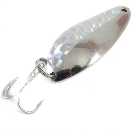 На зворотному боці відполірованого металу глибоко викарбувано напис «LITTLE CLEO WIGL-LURE A SENECA LURE», що ідентифікує цей екземпляр як виріб, випущений ще до того, як компанія Acme придбала Seneca на початку 1980-х років. При довжині 1 1/2" (4 см) та вазі 1/4 унції (7 г), ця нікельована блешня має класичний широкий профіль «крапля», розроблений спеціально для закидання. Один бік лицьової сторони вкритий голографічною призматичною наклейкою з геометричним візерунком у формі трикутників для кращого відблиску світла. Ця приманка виробництва США з кодом товару 3649 перебуває у відмінному стані з оцінкою 5/5 і виглядає як нова. Оснащення складається з гострого трійника зі сріблястим покриттям, закріпленого за допомогою міцного заводного кільця в основі блешні.