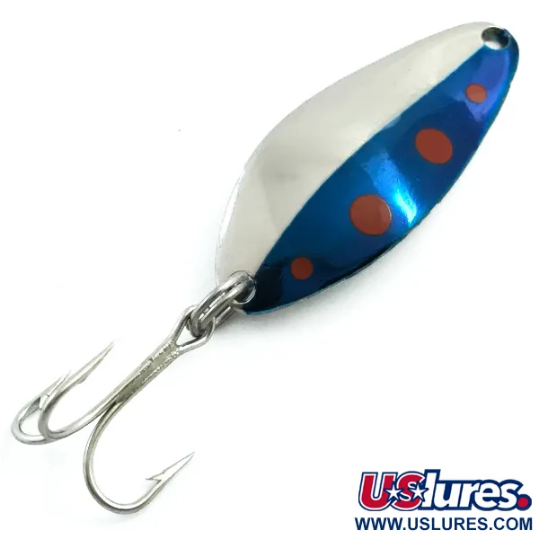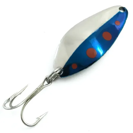 П’ять помаранчево-червоних цяток на темно-синій металізованій панелі прикрашають нікельовану поверхню цієї класичної коливальної блешні. При вазі 1/4 унції (7 г) та довжині 1 1/2 дюйма (4 см), приманка вирізняється солідною товщиною металу, характерною для оригінального виробництва компанії Seneca Lure у США. На звороті чітко вибито клеймо «LITTLE CLEO WIGGLE-LURE A SENECA LURE», що свідчить про її виготовлення ще до того, як бренд перейшов у власність компанії Acme на початку 1980-х років. Даний екземпляр під артикулом 5460 зберігся в ідеальному стані (5/5), маючи чисте та яскраве покриття як на кольоровому, так і на нікельованому боці. Оригінальний трійник залишається гострим і тримається на міцному заводному кільці, що підтверджує високу якість фурнітури тієї епохи. Саме таке забарвлення, де природні відблиски поєднуються з виразними синіми та червоними акцентами, було базовим вибором рибалок для лову різноманітних видів прісноводної риби.