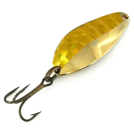 Золотисте покриття корпусу довжиною 4 см (1 1/2") розділене на гладку поліровану частину та текстуровану призматичну смужку, що є типовим для оригінальних приманок Seneca, виготовлених до того, як бренд перейшов у власність Acme на початку 1980-х років. Ця металева коливалка вагою 7 г (1/4 унції) має артикул 7144 та вирізняється глибоким відбитком на звороті «LITTLE CLEO WIGL-LURE A SENECA LURE», що вказує на її походження із США. Оснащення складається з трійника бронзового відтінку та міцного заводного кільця, які чудово зберегли свою цілісність. Стан екземпляра оцінюється як 5/5: він не має жодних слідів використання, а світловідбивна наліпка зберегла чіткі та виразні грані. Характерний вигин корпусу та широка хвостова частина розраховані на закидання на різні глибини або для тролінгу з човна.