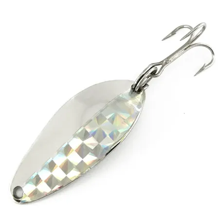 На хромованій зворотній стороні чітко вибито напис «LITTLE CLEO WIGL-LURE A SENECA LURE», що ідентифікує цей екземпляр вагою 1/4 унції (7 г) як оригінальний виріб компанії Seneca Lure ще до її злиття з Acme. Блешня класичної форми «ложка» має довжину 1 1/2 дюйма (4 см) та вирізняється особливим комбінованим оздобленням лицьової сторони, де поліроване срібло межує з геометричною голографічною наклейкою-призмою для відблисків у воді. Саме таке маркування дозволяє віднести приманку до періоду до початку 1980-х років (до об'єднання компаній), що робить її справжньою вінтажною знахідкою американського виробництва для будь-якого колекціонера снастей. Сріблясте покриття залишилося блискучим по всьому корпусу, завдяки чому цей примірник заслуговує на впевнену оцінку стану 5/5. Блешня оснащена рідним сріблястим трійником, закріпленим за допомогою міцного заводного кільця.