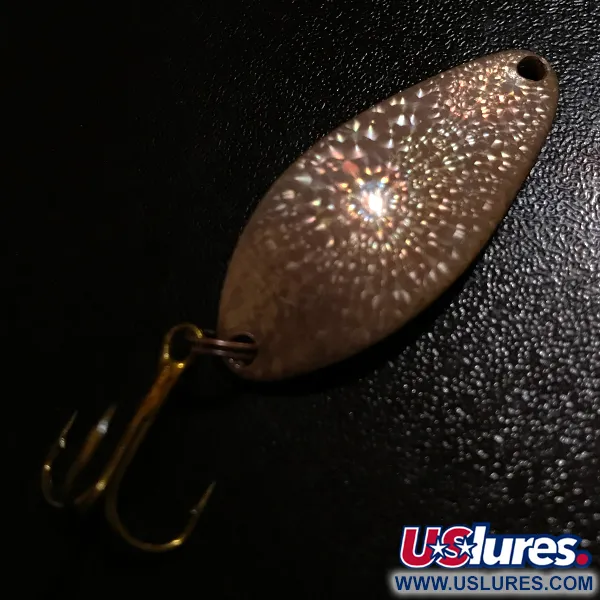 З вибитим на звороті культовим маркуванням «Little Cleo», ця 4-сантиметрова коливалка вирізняється рідкісним покриттям Crystal (Golden Scale) — фактурним візерунком, створеним для вловлювання та розсіювання світла. При вазі 7 г (1/4 унції) цей екземпляр демонструє якість виконання оригінальної американської компанії Seneca Lure Co., виготовлений ще до того, як на початку 1980-х бренд перейшов у власність Acme. Ефект «битого скла» на лицьовій стороні приманки (артикул 8399) залишається надзвичайно чистим і добре відбиває світло. Оснащення складається з міцного верхнього заводного кільця та гострого трійника з бронзовим покриттям. Ця конкретна приманка перебуває у стані 5/5, зі збереженими поверхнями та чітким тисненням. Широка форма з характерним вигином («горбом») є фірмовою рисою дизайну Little Cleo; її часто використовують як для закидання, так і для тролінгу.