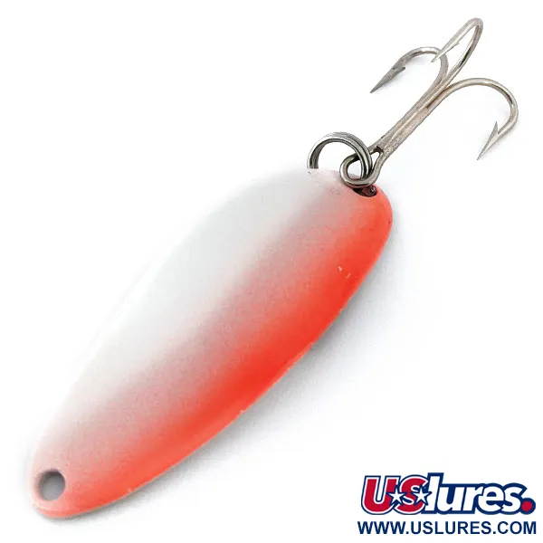 Ця вінтажна коливалка вагою 1/3 унції (10 г) має біле перламутрове покриття, що плавно переходить у насичений червоно-помаранчевий градієнт на лицьовому боці. Приманка завдовжки 1 3/4 дюйма (4,5 см) є оригіналом періоду Seneca; її можна впізнати за кодом товару 14821 та характерним штампуванням у вигляді танцівниці хула на нікельованому звороті. Це зображення є ключовою ознакою для колекціонерів, оскільки воно з’явилося ще до того, як бренд викупила компанія Acme на початку 1980-х років. На зворотному боці також нанесено маркування «Wigl Lure» та «Little Cleo», яке залишилося чітким і добре читається. Оснащення включає міцне заводне кільце та трійник, які не мають жодних ознак старіння. Приманка збереглася у стані 5/5: вона вирізняється яскравим чистим блиском металевого боку та гладким цілісним лакофарбовим покриттям спереду.