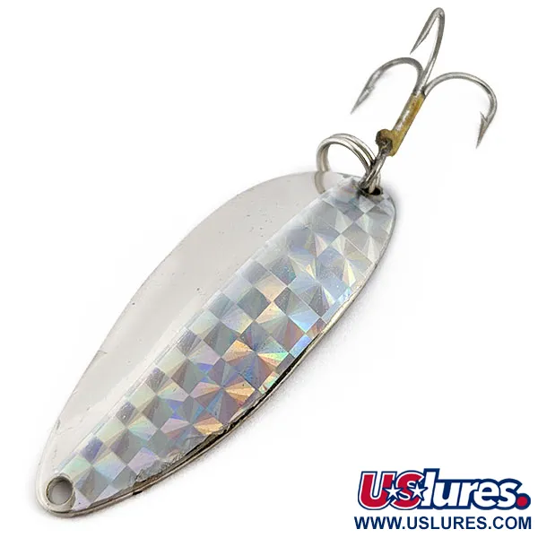 При вазі 1/2 унції (14 г) ця металева коливалка має довжину 2 1/4 дюйма (5,5 см), що робить її чудовим варіантом для далекого закидання. Лицьова сторона вкрита голографічною наклейкою-призмою з візерунком «шахівниця», яка виблискує в різних напрямках. На зворотному нікельованому боці чітко вибито зображення легендарної танцівниці Hula Girl разом із написами «Little Cleo» та «WIGL LURE». Цей екземпляр виробництва Seneca має артикул 17964 і належить до періоду випуску ще до поглинання бренду компанією Acme у 1980-х роках. Приманка оснащена стандартним сріблястим трійником та заводним кільцем у місці кріплення жилки. Стан оцінено на 5/5 — нікельована поверхня зберегла дзеркальний блиск. Пошук приманок саме з оригінальним штампом танцівниці є пріоритетом для багатьох колекціонерів вінтажних американських коливалок.