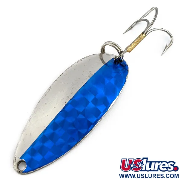 При вазі 14 г (1/2 унції) цей екземпляр вирізняється виразним синім голографічним малюнком луски, що контрастує з полірованим нікелевим покриттям. На зворотному боці чітко викарбувано легендарну танцівницю «Hula Girl» — візитівку оригінальної продукції компанії Seneca Lure до викупу бренду на початку 1980-х років. Маючи довжину 5,5 см (2 1/4 дюйма), ця коливалка уособлює часи, коли логотип із танцівницею був обов'язковим елементом, якому досвідчені рибалки часто завдячують історичною вловистістю приманки. Фурнітура залишається надійною: встановлено оригінальний трійник на потужному заводному кільці. Металеві поверхні виробу під артикулом 17968 мають мінімальні сліди зносу, приманка виглядає охайно, а стан оцінено на 4/5. Гравіювання «WIGL LURE» поруч із танцівницею підтверджує автентичне виробництво США.