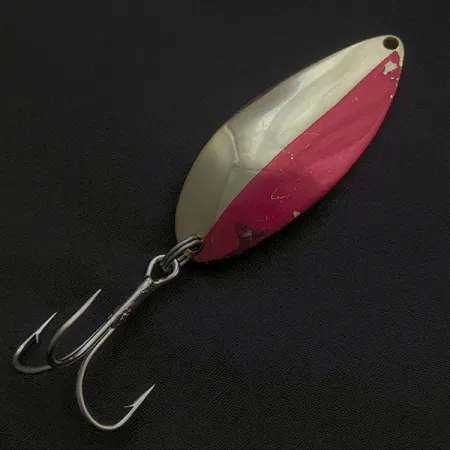 На зворотному боці цієї блешні-коливалки вагою 3/4 унції (21 г) чітко викарбовано культову танцівницю «Hula Girl» — фірмовий знак оригінальної продукції Seneca Lure Company. Цей конкретний примірник під артикулом 21075 належить до епохи, що передувала купівлі бренду компанією Acme Tackle на початку 1980-х, після чого зображення танцівниці припинили наносити на приманки. При довжині 2 1/2 дюйма (6,5 см) лицьова сторона має двоколірне золотисто-рожеве покриття. На фарбованій частині помітні сліди природного зносу та незначні сколи, характерні для її віку, проте блешня залишається у відмінному стані з оцінкою 5/5. Вона оснащена міцним трійником із широким зівом та надійним заводним кільцем для впевненої роботи під час закидання чи тролінгу. Латунне тіло зберегло свій металевий блиск, підкреслюючи якість виконання, завдяки якій ці коливалки Seneca стали невід'ємною частиною арсеналу рибалок по всьому США.