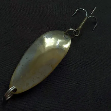 Відтінки латуні та нікелю поєднуються на поверхні цієї 5,5-сантиметрової коливної блешні — характерний вигляд оригінальної лінійки Seneca. Цей конкретний екземпляр з артикулом 22288 має на звороті легендарне штампування у вигляді танцівниці — саме через цю деталь досвідчені рибалки прозвали її «Hula Girl». Чимало рибалок зі стажем цінують саме версію з малюнком танцівниці, виробництво якої припинилося після того, як компанія Acme придбала Seneca Lure на початку 1980-х років. При вазі 18 г товстий метал забезпечує солідну масу, необхідну для далекого закидання. Штампування на звороті чітко містить напис «Wig-L-Lure» разом із даними про виробника, що підтверджує її походження з часів виробництва у США. Щодо стану, приманка оцінюється на впевнені 3/5: помітні сліди експлуатації та потьмяніння оригінального покриття свідчать про її поважний вік. Заводні кільця та трійник цілі й надійно закріплені на корпусі.