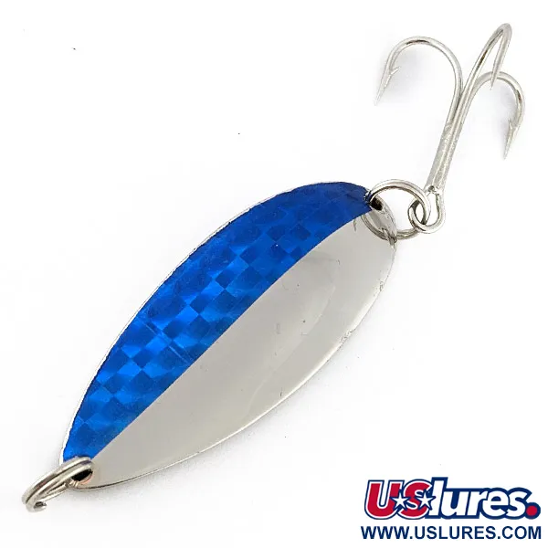 Блиск синьої призматичної наклейки на відполірованому нікелевому корпусі цієї 21-грамової (3/4 унції) коливної блешні одразу привертає увагу. На зворотному боці чітко викарбувано силует знаменитої танцівниці «Hula Girl» — фірмовий знак оригінальних виробів Seneca до того, як бренд перейшов у власність компанії Acme на початку 1980-х. При довжині 6,5 см (2 1/2 дюйми) цей екземпляр зберігся у чудовому стані, отримавши оцінку 5/5 за блиск поверхонь та чіткість відтиску. Колекціонери часто полюють саме на модель 23208, оскільки на сучасних версіях легендарна танцівниця відсутня, хоча багато досвідчених рибалок переконані, що саме вона була запорукою успіху цієї приманки в минулому. Фурнітура також у відмінному стані: чисті заводні кільця та гострий трійник повністю готові до використання на воді. Саме це поєднання нікелю та синього кольору забезпечує високу контрастність, а маркування «MADE IN U.S.A.» підтверджує справжнє американське походження приманки.
