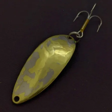 На зворотному боці цієї блешні вагою 1/2 унції (14 г) чітко викарбовано силует танцівниці — характерну ознаку оригінальної продукції епохи Seneca. Цей конкретний екземпляр під артикулом 24364 має впізнаване двоколірне покриття «нікель/золото» та класичну карбовану текстуру з лицьового боку. Тіло у формі краплі довжиною 2 1/4 дюйма (5,5 см) оснащене міцним трійником, закріпленим на стандартному заводному кільці. Історичне гравіювання «Hula Girl» з’явилося завдяки захопленню засновника Seneca Чарлі Кларка рухами танцівниці; цей елемент дизайну поступово зник після того, як у 1980-х роках компанію викупила Acme. Важка металева конструкція спеціально розроблена для закидів у глибоку товщу води, де двоколірне покриття забезпечує контрастні відблиски. Поверхні демонструють добре збережене покриття з незначними ознаками віку, що відповідає оцінці стану 4/5. Оригінальний напис «Wig-L-Lure» біля отвору для кріплення волосіні залишається розбірливим, підтверджуючи походження приманки з виробництва у штаті Нью-Йорк.