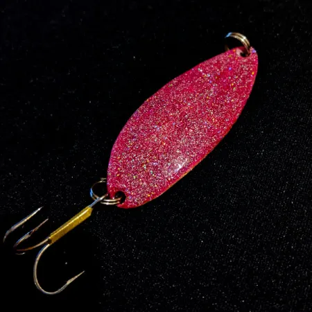 Опукла сторона цієї коливальної блешні вагою 14 г (1/2 oz) вкрита рожевим покриттям із блискітками, що створює фактурні відблиски у воді. На зворотному боці, поверх нікельованого покриття, виштампувана класична фігурка танцівниці «Hula Girl» разом із брендуванням Seneca Lure. Ці оригінальні версії від Seneca високо цінуються рибалками, які вважають логотип із танцівницею справжнім талісманом на удачу. Блешня має довжину 5,5 см (2 1/4") та характерну вигнуту форму корпусу, розроблену для стабільної гри під час закидання або тролінгу. Цей екземпляр знаходиться у стані 4/5: присутні сліди зносу поверхні, характерні для її віку, проте штамповані графічні елементи залишаються чіткими та розбірливими. Після поглинання компанії Seneca на початку 1980-х років штамп із танцюристкою хула з часом зник із виробництва, що робить цю приманку раннім зразком епохи Seneca. Артикул: 24623.