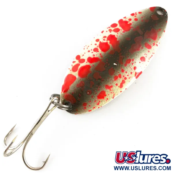 Набризки червоної та коричневої фарби на біло-нікелевій основі надають цій блешні вагою 14 г (1/2 унції) виразного контрастного вигляду, що робить її добре помітною у воді. На звороті приманки розміщено культове гравіювання танцівниці «Hula Girl» — фірмовий знак оригінальних виробів Seneca Lure до того, як компанія Acme прибрала це лого після поглинання бренду на початку 1980-х. При довжині 5,5 см (2 1/4 дюйма) нікельований зворот також містить штампи «LITTLE CLEO» та «WGL LURE» поруч із силуетом танцівниці. Цей екземпляр з артикулом 4248 зберігся в ідеальному стані (5/5) з чистим покриттям та яскравим блиском металу. Товстостінна конструкція оснащена міцним заводним кільцем та надійним трійником, що характерно для якості, якою славилася Seneca до переходу бренду. Чимало колекціонерів віддають перевагу саме цим раннім версіям через гравіювання танцівниці, яке стало символом спадщини цієї приманки серед поціновувачів оригінальних американських розробок.