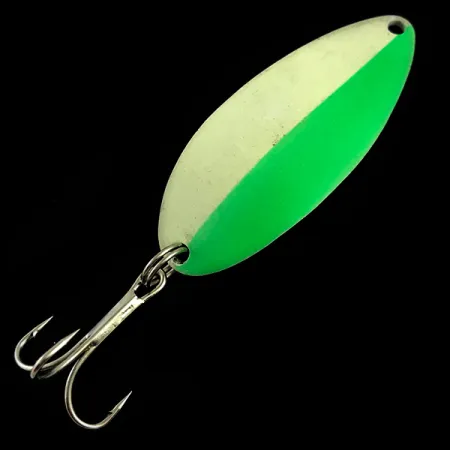 Ця блешня вагою 1/2 унції (14 г) із культовим гравіюванням танцівниці хула на відполірованому нікельованому звороті уособлює класичну епоху дизайну американських снастей від компанії Seneca Lure. Приманка під артикулом 5981 має характерне двоколірне забарвлення: одна половина світлонакопичувальна біла, а інша — насичено-зелена. Ця конкретна версія випущена до поглинання компанії брендом Acme на початку 1980-х, після чого впізнаване гравіювання танцівниці згодом зникло з виробництва. При довжині 2 1/4 дюйма (5,5 см) метал зберіг чистий вигляд, а написи, включно з текстом «WIGL LURE», залишаються чіткими. Екземпляр зберігся в ідеальному стані (5/5), демонструючи високу якість виготовлення, яка зробила блешні Seneca справжньою класикою для лову форелі та лосося. Надійний трійник кріпиться через міцне заводне кільце в основі краплеподібного корпусу.