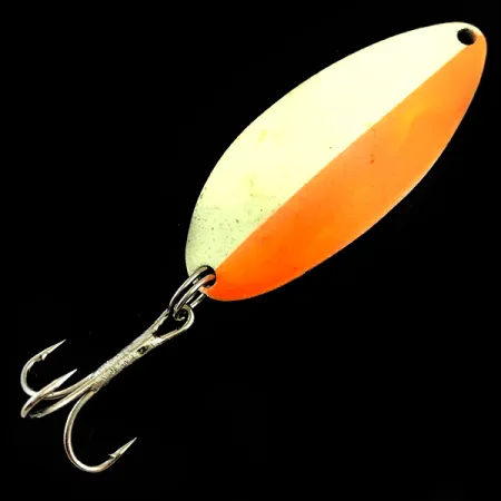 Завдяки значній вазі у 2/3 унції (18 г), ця коливалка є чудовим вибором для облову глибоких шарів води, де її світлонакопичувальне покриття стає максимально помітним. При довжині 2 1/4" (5,5 см), лицьова сторона приманки розділена по діагоналі на яскраво-помаранчевий та білий люмінесцентний кольори. Зворотний бік виконаний у полірованому нікелі та прикрашений легендарним штампом «Hula Girl» — характерною деталлю епохи оригінальної компанії Seneca Lure до її переходу під бренд Acme на початку 1980-х років. Колекціонери часто шукають саме маркування «WIGL LURE» та зображення танцівниці, оскільки вони уособлюють спадщину американської лінійки Little Cleo. Цей екземпляр з артикулом 5982 зберігся у надзвичайно чистому стані, отримавши оцінку 5/5 за збережену фарбу та блиск фурнітури. Блешня оснащена міцним трійником на надійному заводному кільці й готова як для коробки з приманками, так і для колекційної вітрини.