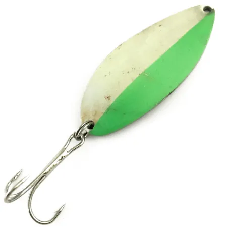 Викарбувана фігурка танцівниці на нікельованому звороті підтверджує, що цей екземпляр є оригінальним виробом Seneca Lure Company, виготовленим ще до того, як бренд перейшов до компанії Acme на початку 1980-х років. Лицьова сторона пелюстки завдовжки 6,5 см (2 1/2") має класичне двоколірне забарвлення: поєднання яскраво-зеленого кольору та білого світлонакопичувального покриття. На звороті чітко видно напис «LITTLE CLEO WIG-L LURE» разом із маркуванням ваги 21 г (3/4 унції). Багато рибалок віддають перевагу саме моделям епохи «Hula Girl», вважаючи штампований силует ключовим фактором легендарної уловистості цієї блешні. Оснащення включає трійник оригінального стилю, закріплений на заводному кільці. Стан приманки оцінено на 5/5: фарба та нікельоване покриття збереглися в ідеальному чистому вигляді. Ця модель американського виробництва ідентифікується за артикулом 5999.