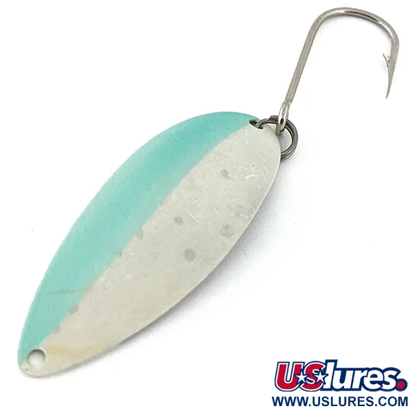 Ця коливна блешня вагою 1/4 унції (7 г), розділена навпіл за кольором — ніжно-бірюзова з одного боку та матове срібло з іншого, — представляє окрему главу в історії виробництва компанії Seneca. При недостатньому освітленні вся поверхня завдяки світлонакопичувальному покриттю випромінює яскраве зелене світло, що забезпечує чудову помітність на великій глибині. На зворотному боці металевого тіла розташоване характерне тиснення у вигляді танцівниці «Hula Girl» — деталь, що вирізняє оригінальні приманки Seneca, виготовлені до переходу бренду до компанії Acme на початку 1980-х років. Цей екземпляр з артикулом 14826 має довжину 2 1/2 дюйма (6,5 см) і оснащений одинарним гачком типу «сайваш», закріпленим на міцному заводному кільці. Покриття добре збереглося (оцінка стану 4/5): воно має лише ледь помітні ознаки свого віку, повністю зберігаючи робочі характеристики. Багато досвідчених рибалок і досі надають перевагу саме штампу «Hula Girl», вважаючи, що ця деталь на звороті відіграла важливу роль у становленні легендарного статусу приманки.