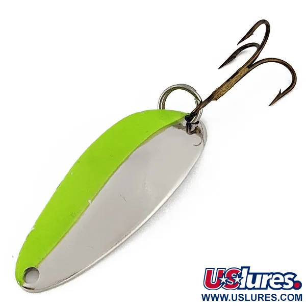 На нікельованій зворотній стороні викарбувано легендарну танцівницю «Hula Girl» — фірмовий знак компанії Seneca Lure до початку 1980-х років. Цей екземпляр Little Cleo (Hula Girl) UV вагою 1/3 унції (10 г) має довжину 1 3/4 дюйма (4,5 см) та вирізняється характерним двоколірним забарвленням на опуклій лицьовій частині. Одна половина вкрита яскравим ультрафіолетовим шаром кольору «шартрез», а інша зберігає чистий нікелевий блиск. На увігнутій спинці чітко видно гравіювання «Little Cleo» та «Seneca Lure» поруч із фігуркою танцівниці, яку багато досвідчених рибалок вважають секретом історичного успіху цієї приманки. Оснащена оригінальною фурнітурою, включаючи трійник із бронзовим покриттям та надійне заводне кільце, ця модель є вершиною епохи Seneca. Стан оцінено на 5/5: чиста поверхня та добре збережені відбитки штампів роблять її справжньою знахідкою для колекціонерів американських металевих приманок середини минулого століття. Код товару для цієї приманки — 19209.