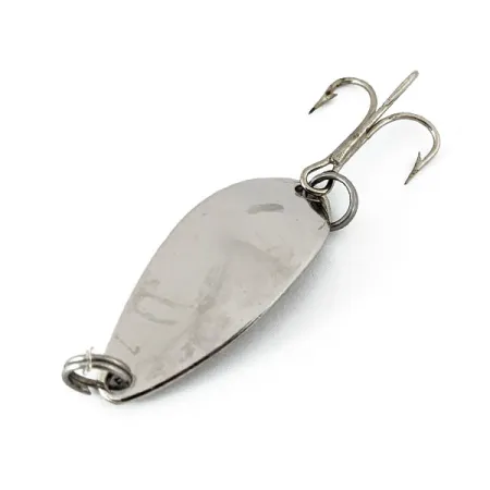 На задній поверхні викарбувана легендарна назва «LITTLE CLEO» — ця блешня вагою 1/8 унції (3,5 г) втілює спадщину оригінальної компанії Seneca Lure. При довжині 1 1/4 дюйма (3 см) цей примірник має класичне нікелеве покриття, що зберегло свій блиск і світловідбивні властивості. Знайти виріб епохи до 1980-х років — періоду до того, як Seneca була викуплена компанією Acme — справжня вдача для будь-якого колекціонера вінтажу, особливо якщо приманка виготовлена в США. Оснащення включає міцне заводне кільце в носовій частині та ще одне у хвості, на якому закріплено гострий трійник; загальний стан оцінюється на 5/5. Саме характерна вигнута форма тіла принесла Little Cleo славу серед любителів лову форелі та окуня задовго до того, як вона стала обов'язковим елементом кожної сучасної рибальської коробки. Ця конкретна модель періоду Seneca (артикул 14629) демонструє високоякісне штампування та конструкцію з товстого металу, що були характерними для раннього американського виробництва приманок.