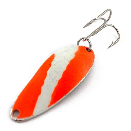 Вага 1/4 унції (7 г) робить цю класичну блешню універсальним вибором для лову різноманітних видів прісноводних риб. При довжині 1 1/2 дюйма (4 см) корпус має той самий легендарний S-подібний силует, якому рибалки довіряють уже багато поколінь. Ця модель бренду Seneca (артикул 15539) виконана у контрастному забарвленні з помаранчевих та білих смуг. В ультрафіолеті помаранчеві ділянки демонструють потужну флуоресценцію, що допомагає приманці залишатися помітною у каламутній воді або під час ранкових та вечірніх сутінків. Виготовлена в США, вона відрізняється якістю збірки та надійністю, що відповідають високим стандартам того часу. Приманка перебуває у чудовому стані (оцінка 5/5), з чистою поверхнею та добре збереженою фурнітурою, включаючи оригінальне заводне кільце та трійник. Штампований метал ефективно відбиває світло, підкреслюючи характерну форму та вигин, властиві виробам Seneca тієї епохи.