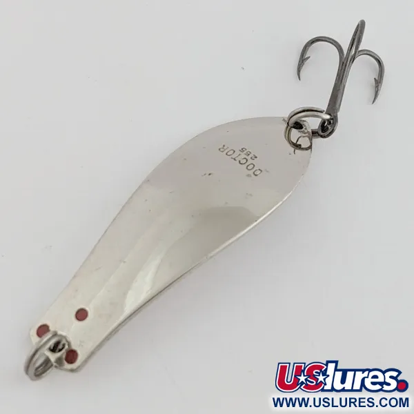 Ця нікельована блешня-коливалка від Prescott Spinner має штампування «DOCTOR 255» на увігнутій стороні та довжину 4,5 см (1 3/4"). Вага 7 г (1/4 oz) і корпус із цільної латуні дозволяють блешні стабільно тримати гру на різних швидкостях проводки. Три маленькі червоні цятки біля вушка створюють тонкий візуальний контраст на фоні яскравого металевого покриття. Вузька форма «вербовий листок» розроблена для імітації силуету дрібної кормової риби, що часто є ефективним при лові щуки або форелі. Даний екземпляр перебуває у стані 5/5, має чисту поверхню та чітке маркування. Виріб з артикулом 24455 є чудово збереженим зразком рибальського оснащення середини минулого століття.