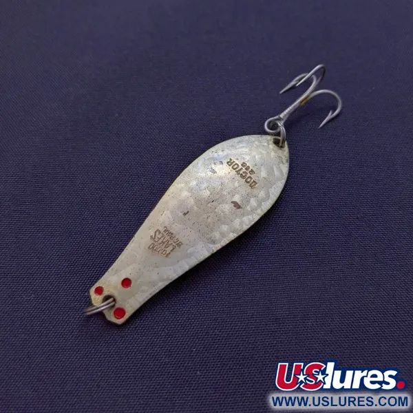 Візерунок Crystal створює яскраві відблиски, що імітують рух луски малька. Майстерня Prescott Spinner виготовила Little Doctor 255 з латунним корпусом, що забезпечує необхідну вагу при довжині 1 3/4" (4.5 см) та масі 1/4 унції (7 г). Штамповане маркування на лицьовій стороні чітко ідентифікує модель разом із клеймом виробника «LAKES Prescott Wis». Три невеликі червоні акценти біля голови слугують точкою атаки на фоні блискучого металевого покриття. Ця приманка під артикулом 24525 збереглася у стані 5/5 і є класичним вибором для ловлі щуки, судака або палії. Звужена форма вербового листка гарантує, що латунний корпус стабільно тримає гру під час рівномірної проводки.