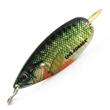 Голографічне зображення луски райдужної риби виконане з високою чіткістю по всій поверхні цієї коливалки Northland. Приманка з артикулом 21249 має довжину 7 см (2 3/4") і вагу 21 г (3/4 унції), що дозволяє точно подавати її у потрібний горизонт води. Одинарний гачок у золотистому кольорі захищений витонченим дротяним відбійником, розробленим для проходження крізь латаття та зарості без зачепів. Анатомічне забарвлення з виразним грудним плавцем та реалістичним оком підсилює подібність приманки до справжньої здобичі. Блешня виготовлена в США і перебуває в ідеальному стані (5/5), без жодних ознак використання та зі збереженням глибини металевого блиску. На верхньому краї чітко вибито назву серії «LIVE-FORAGE», а в носовій частині закріплене невелике металеве вушко для жилки. Зворотний бік металевого тіла має поліровану золотисту поверхню, яка створює контрастні відблиски.