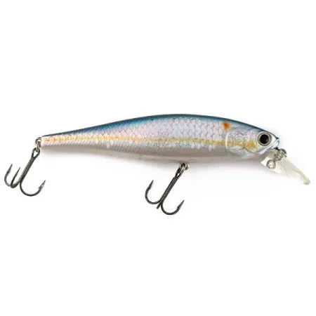 Забарвлення Crack black nip визначає цей 10-сантиметровий екземпляр, що має темну, майже чорну спинку, яка переходить у деталізовану сріблясту луску, підкреслену золотаво-жовтою бічною лінією. Lucky Craft Pointer 100 під артикулом 19204 — це воблер класу мінноу японського виробництва вагою 18 г із нейтральною плавучістю. Його прозора лопатка розроблена для роботи на глибинах від 1,2 м до 1,5 м, що робить приманку базовим вибором для лову хижака, який тримається в товщі води. Внутрішня шумова камера забезпечує специфічний акустичний супровід у товщі води. Ця конкретна приманка збереглася у стані 5/5, зберігши глянцеве покриття та гострі оригінальні трійники. Невелика яскраво-помаранчева пляма розташована одразу за зябровою кришкою, створюючи локальну точку контрасту на фоні сріблястого корпусу.