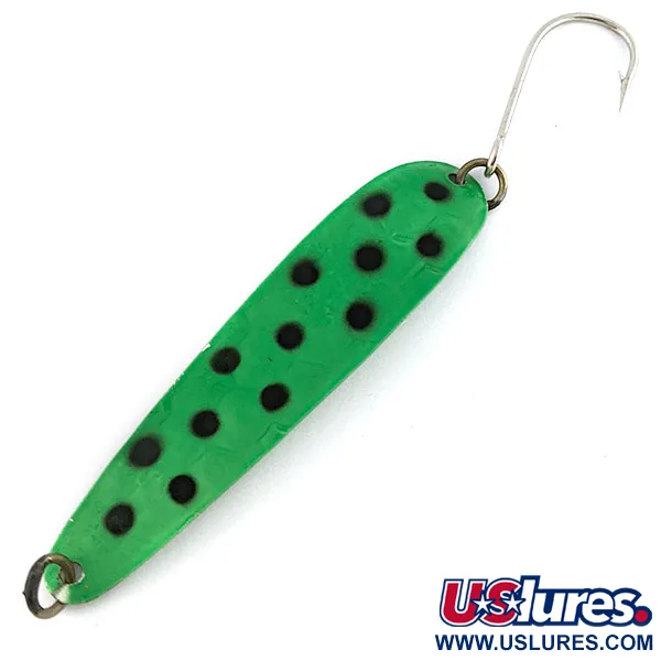 Ця класична приманка з історії Худ-Рівер має характерне вузьке металеве тіло завдовжки 8 см (3 1/4 дюйма). При вазі 4,5 г (3/16 унції) блешня розрахована на тролінг легкими снастями. На зворотному боці чітко видно штамп «FLUTTER SPOON LUHR JENSEN», що свідчить про багаторічну історію бренду з Орегону, США. Цей екземпляр має яскраво-зелене покриття, оздоблене чорними цятками з м'якими краями. У верхній частині вибито номер «44», що вказує на конкретний розмір у каталозі. Кожен компонент, від одинарного гачка до заводних кілець, зберігся у відмінному стані з оцінкою 5/5. Ця невикористана блешня дбайливо зберігалася; код товару — 19549.