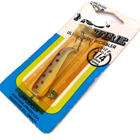 Маючи вагу 1/4 унції (7 г), ця вінтажна блешня Hus-lure представляє класичну епоху виробництва Luhr Jensen у Гуд-Рівер, штат Орегон. Довжина приманки становить 2 дюйми (5 см), вона виконана у детальному забарвленні «райдужна форель», що вирізняється кремовим корпусом, ніжно-рожевою бічною лінією та розсипом темних цяток. Цей екземпляр з артикулом 10637 досі закріплений на оригінальній картонній підкладці, яка містить історичні відомості про каталог виробника та дистрибуцію в Канаді. Приманка не була у використанні, вона зберегла оригінальне заводське покриття та фурнітуру, зокрема трійник і заводне кільце. Пакування має фірмове синьо-жовто-біле оформлення, характерне для вінтажної продукції цього бренду.
