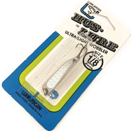 Вузький профіль довжиною 1 1/2" (4 см) вирізняє блешню Luhr Jensen Hus-lure — класичний вибір для риболовів, які полюють на форель та окуня з легкою снастю. Цей конкретний екземпляр з артикулом 1193-018-150 не був у використанні та зберігається в оригінальному вінтажному блістері часів виробництва у Гуд-Рівер, штат Орегон. Блискуче нікелеве покриття доповнене з одного боку світловідбивальною вставкою з призматичним візерунком «під луску», що активно відблискує під час проводки. Завдяки вазі 1/8 унції (4 г), конструкція приманки розрахована на точне закидання або повільний тролінг. Блешня оснащена оригінальною заводською фурнітурою, зокрема гострим трійником на заводному кільці. Пакування добре збереглося, воно має впізнаваний синьо-зелений дизайн бренду Luhr Jensen та чітке маркування розміру.