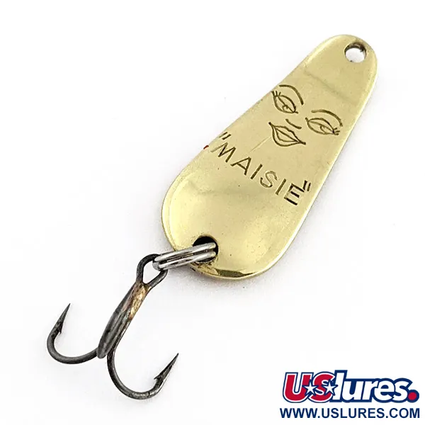 На золотистій опуклій стороні викарбувано привабливе стилізоване обличчя та назву «MAISIE», а сам краплеподібний профіль блешні відображає особливий період в історії рибальських снастей Тихоокеанського Північного Заходу. При вазі 1/4 унції (7 г) та довжині 1 1/2 дюйма (4 см) ця цільнометалева приманка відчувається добротною та якісною для свого розміру. На звороті міститься клеймо бренду «LUHR JENSEN», що прямо вказує на її походження та американське виробництво. Оцінка стану 5/5 є цілком справедливою, оскільки золотисте покриття залишається яскравим, з лише незначними поверхневими слідами від багаторічного зберігання. У хвостовій частині встановлено міцне заводне кільце з темним трійником, а в носовій частині — акуратний отвір для кріплення волосіні. Цей конкретний екземпляр під кодом 22908 є рідкісним зразком креативного підходу виробника до дизайну функціональних коливалок.