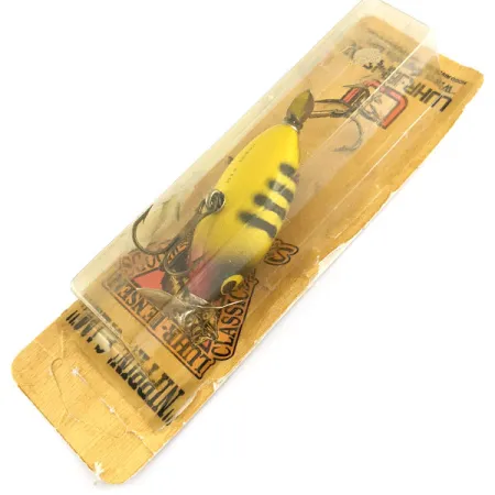 Яскраво-жовте тіло з виразними чорними вертикальними смугами вирізняє цю класичну дерев'яну поверхневу приманку із серії «Classic Woods». Рибалки та колекціонери однаково цінують Luhr Jensen Nippin Sam Wood за її характерний пропелер у хвостовій частині, розроблений для створення сплесків та збурень на поверхні води під час закидів поблизу берегових укриттів. Цей конкретний екземпляр з артикулом 21801 має особливий червоно-пурпуровий градієнт під «горлом», що створює контрастну точку атаки. При довжині 2 1/4 дюйма (6 см) та вазі 3/16 унції (6 г) компактний дерев'яний корпус приманки розрахований на точну подачу. Приманка досі зберігається в оригінальному блістерному пакуванні, вона не була у використанні, завдяки чому заводське лакофарбове покриття та рідна фурнітура залишилися незмінними. Вінтажна картонна підкладка містить примітку «Special Top-Water Note» та старі контактні дані сервісної служби, що підкреслює її походження з часів виробництва у США. На черевці приманки нанесено штамп із назвою моделі, а гачки залишаються у заводській комплектації.