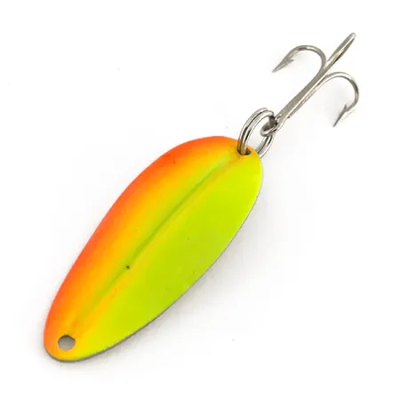 Ця блешня TODDCO Main liner вагою 2/5 унції (11 г) вирізняється особливим двоколірним забарвленням, розробленим для кращої гри кольорів за певного освітлення. Тіло довжиною 2 дюйми (5 см) з лицьового боку вкрите яскравою жовтою та помаранчевою флуоресцентною фарбою, тоді як зворотний бік зберіг класичний нікелевий блиск. Колекціонери впізнають у цій приманці модель Main liner UV під артикулом 7638, яка була невід'ємною частиною американського ринку снастей і вироблялася до 1980 року. Цей конкретний екземпляр не був у використанні, завдяки чому оригінальне заводське покриття збереглося без слідів зносу, зазвичай притаманних приманкам такого віку. Ключовою особливістю цієї блешні є її здатність реагувати на ультрафіолет: під дією УФ-променів флуоресцентні пігменти випромінюють яскраве зелене та помаранчеве світіння — це технічне рішення покликане зберегти помітність приманки на глибині або в каламутній воді. Оснащення складається з міцного заводного кільця та гострого трійника, придатних як для лову в закид, так і для тролінгу.