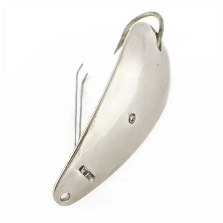 Срібне покриття підкреслює стрункий профіль цієї 5,5-сантиметрової (2 1/4") моделі Master Weedless Lotta Junior. Ця приманка американського виробництва має масивний металевий корпус з одинарним впаяним гачком, призначеним для лову в густих заростях. Для захисту від зачепів біля основи гачка встановлено пару пружних дротяних вусів, що спрямовані вгору до самого жала. Даний екземпляр з артикулом 24158 має яскраву поверхню у чудовому стані, що повністю відповідає оцінці 5/5. Акуратно просвердлений отвір у носовій частині дозволяє кріпити жилку напряму або через вертлюг. Вага 12 г (2/5 унції) забезпечує приманці солідну масу для далекого закидання. Невелика заклепка та штамповане маркування на корпусі ілюструють методи виробництва середини минулого століття, які використовував бренд Master.