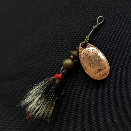 Широка мідна пелюстка цієї моделі Aglia виблискує металом, на ній чітко видно штамп «MEPPS-0-AGLIA» та «FRENCH PAT.». Ця вертушка з артикулом 18184 вагою 2,5 г (3/32 унції) оснащена класичною системою Mepps із конусом, що забезпечує миттєвий запуск пелюстки відразу після потрапляння у воду. Приманка завдовжки 4,5 см (1 3/4 дюйма) оснащена трійником з опушкою з натурального хутра вивірки, закріпленого виразною червоною обмоткою. Оснащення включає низку латунних намистин та більше за розміром кулясте грузило, що збалансовує дротяну вісь. Хоча комплектуючі виготовлені у Франції, фінальна збірка відбулася у США — це характерна риса історії бренду, яка набула значного розмаху за часів Тодда Шелдона. Екземпляр перебуває у відмінному стані (5/5), металеві поверхні добре збережені, а опушка чиста та густа. Модель у розмірі 0 — це традиційний вибір для лову на легку снасть, коли ціллю є форель або окунь.