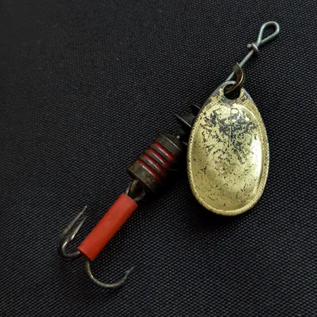 На зворотному боці позолоченої пелюстки чітко викарбувано маркування «MADE IN FRANCE» — фірмовий знак конструкції Андре Мюльнара, що стала невід'ємною частиною рибальських коробок ще з кінця 1930-х років. Ця Mepps Aglia 1 з артикулом 18048 вирізняється легендарною опуклою формою пелюстки, золотиста поверхня якої привабливо відблискує у воді. При вазі 1/8 унції (3,5 г) та загальній довжині 2 дюйми (5 см), приманка зібрана на міцному дротяному каркасі, що тримає червоне рифлене осердя та латунну дужку. Золотаве покриття пелюстки має незначні потемніння та сліди зносу, що цілком відповідає оцінці стану 4/5 для доглянутої речі. На цівку трійника натягнуто яскравий червоний кембрик, який слугує виразною точкою атаки. Цей екземпляр належить до перехідного періоду, коли комплектуючі виготовлялися у Франції, а збирання часто проводилося в США; це дозволило зберегти мінімальні допуски, завдяки яким пелюстка починає вільно обертатися відразу після натяжіння жилки. Фурнітура залишається робочою, а дротяне вушко надійно тримає форму для кріплення до оснастки.