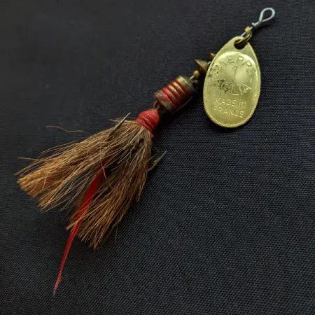 Позолота на овальній пелюстці з фірмовим штампом «MADE IN FRANCE» підкреслює європейське походження цієї вертушки 1-го номера. При вазі рівно 1/8 унції (3,6 г) та довжині 2 дюйми (5 см) ця модель має артикул 18044. Опушка на трійнику складається з густого пучка натуральної коричневої шерсті вивірки, доповненого одним яскраво-червоним пером індички. Ця специфічна конфігурація, зібрана в США з пелюсткою французького виробництва, оснащена ступінчастим латунним осердям з червоними смугами, яке надійно тримається на дротяному стрижні. Mepps Aglia 1 Dressed використовує точну систему обертання на конусі, розроблену для того, щоб золотиста пелюстка «заводилася» миттєво при контакті з водою. Створений Андре Мюльнаром у 1938 році, широкий профіль пелюстки Aglia розроблений для стабільної гри на різних швидкостях проводки. Блешня перебуває в стані 5/5 без жодних ознак використання, а штампований напис «MEPPS 1 AGLIA» чітко виділяється на дзеркальній металевій поверхні.