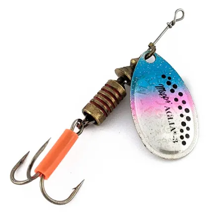 Цівка трійника цієї Mepps Aglia 3 закрита яскраво-помаранчевим флуоресцентним кембриком, що створює помітну точку атаки для хижака, який переслідує приманку. Пелюстка 3-го номера має сріблясту основу з блакитно-рожевим градієнтом та прикрашена чіткими чорними цятками. Ця вертушка з артикулом 19397 важить 7 г (1/4 oz), а її загальна довжина становить 7 см (2 3/4"). Осердя приманки складається з рифленого латунного вантажу та набору намистин, завдяки яким пелюстка вільно обертається на каркасі з нержавіючого дроту. Стан цього примірника — 5/5: заводське фарбування та фурнітура ідеально збережені. Блешня зібрана в США з французьких комплектуючих; на пелюстці виштампувано назву та розмір, що вшановує традиції дизайну Андре Мельнарта, закладені ще у 1938 році. Дріт закінчується надійною петлею для кріплення снасті.